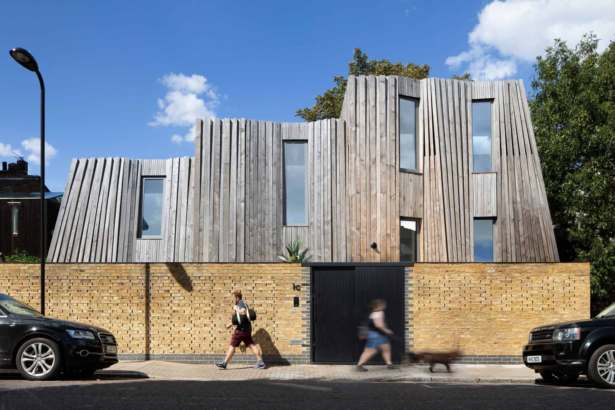 The house is overlooked from all sides and above, and is excavated and chamfered to fit tightly between neighbours.